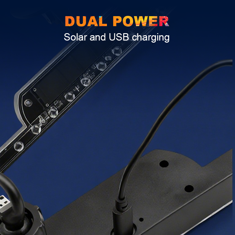 ALIMENTATION DUAL : La barre lumineuse combine la charge solaire et USB pour une commodité écologique. Les panneaux solaires maintiennent l'énergie pendant la journée, tandis que l'USB fournit une charge de secours rapide si nécessaire, garantissant des performances constantes dans toutes les conditions de conduite.