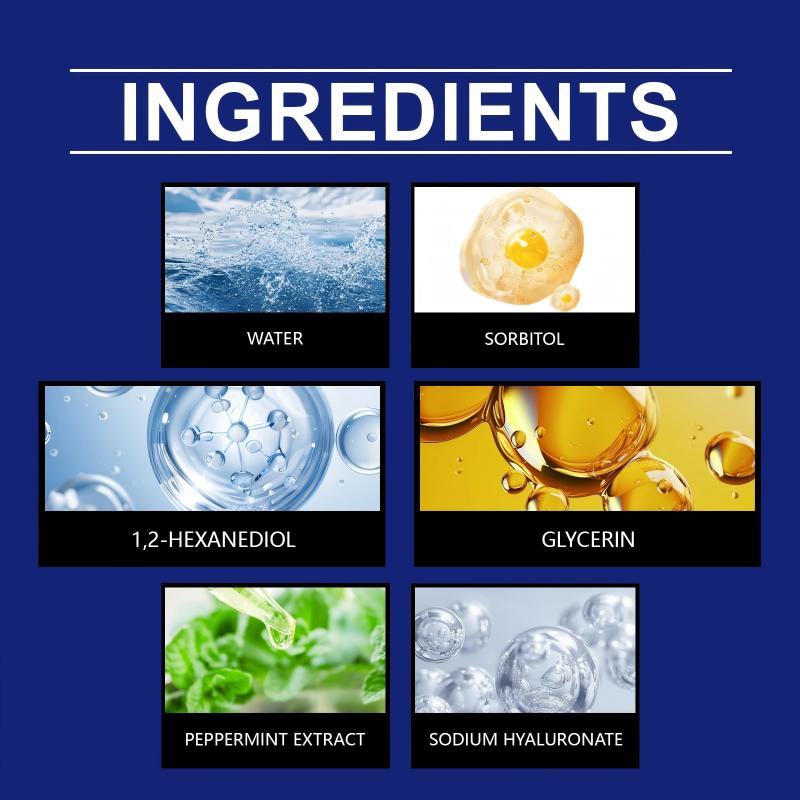 🌱 Ingrédients clés : Eau, Sorbitol, 1,2-Hexanediol, Glycérine, Extrait de Menthe, Hyaluronate de Sodium