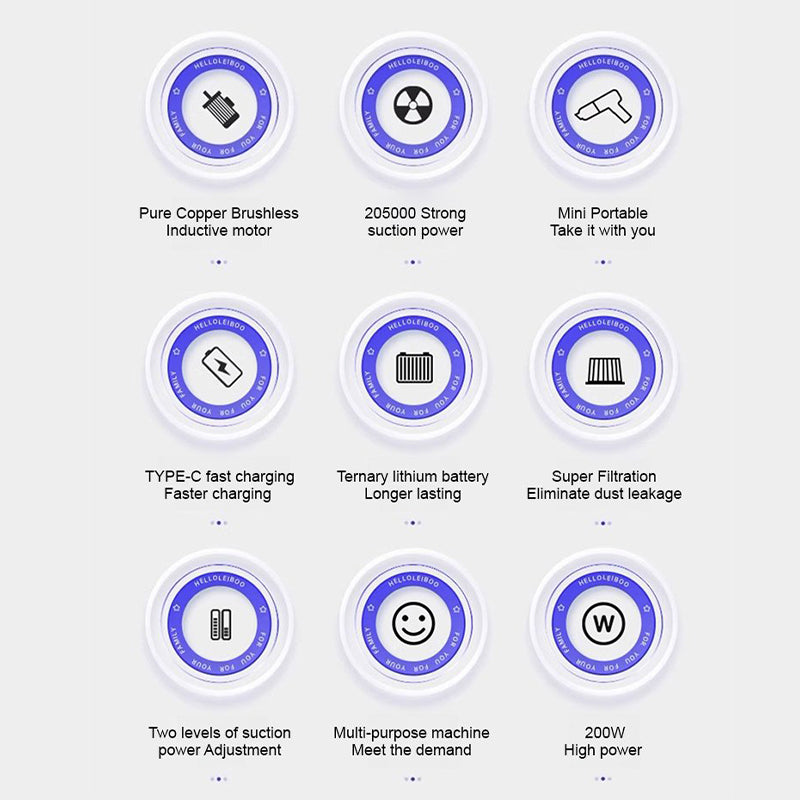 Contenu de l'emballage : 1 aspirateur portable multifonction puissant, 1 longue buse, 1 brosse, 1 cĂąble de recharge, manuel d'utilisation, sĂšche-cheveux