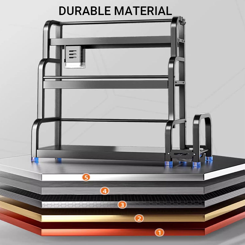 MATÉRIAUX ÉCOLOGIQUES- Les pieds ajustables en silicone assurent une prise ferme et anti-dérapante tout en protégeant votre plan de travail. Fabriqué avec des revêtements écologiques et des matériaux durables, cette étagère allie style moderne et praticité.